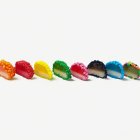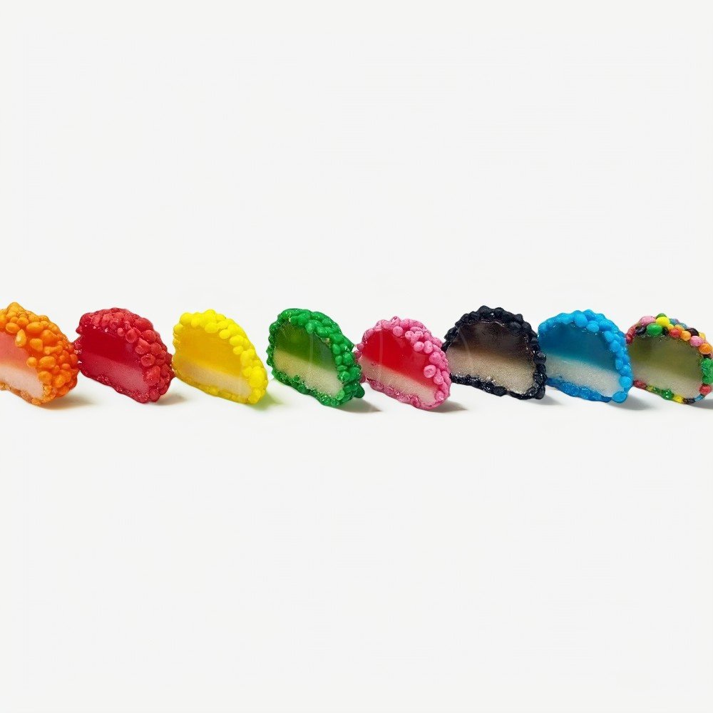 Составсахар, сироп глюкозы, вода, декстроза, рисовая мука, желатин, кислоты: яблочная кислота, гидромалат натрия, инвертный сахарный сироп, желирующий агент: пектин, регулятор кислотности: лимонная кислота, ароматизаторы идентичные натуральным, глазирующие вещества: гуммиарабик, красители: тартразин, кармуазин, красный очаровательный АС, бриллиантовый синий FCF, сульфитно-аммиачная карамель, растительный углерод