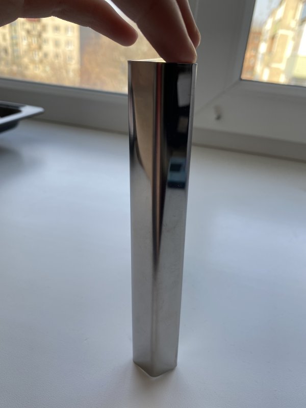 Шпатель очень качественный, металл прочный (как у колец для выпечки данного бренда). Единственный минус - это неровное основание ручки. Это видно на фото, где я сверху придерживаю пальцем. Если выравнивать торт правой рукой и поставить шпатель на стол, то он упадёт. Другой стороны край ровный. Данный нюанс не отражается при работе с тортом, но стоит привыкнуть(